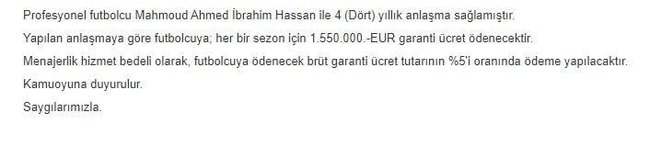 "Profesyonel futbolcu Mahmoud Ahmed İbrahim Hassan ile 4 (Dört) yıllık anlaşma sağlamıştır.