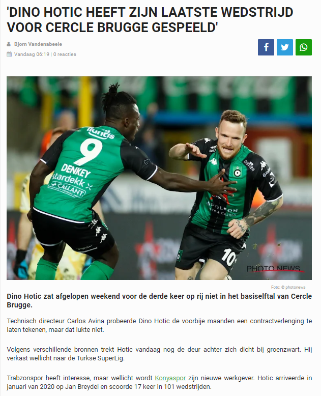 Belçika basınında yer alan habere göre Fırtına, Cercle Brugge'den Dino Hotic'i gündemine almıştı. Fırtına'nın radarında olan Bosnalı milli oyuncuya Konyaspor'da talip oldu. Oyuncu Süper Lig'de forma giymeye sıcak baktığı aktarılırken Abdullah Avcı'nın transferi onayladığına yer verildi.