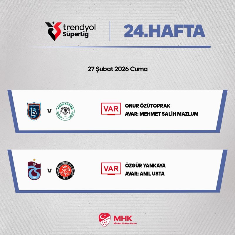 Öte yandan ligde 27 Şubat Cuma günü oynanacak diğer maç olan RAMS Başakşehir-TÜMOSAN Konyaspor maçının VAR hakemi ise Onur Özütoprak olarak açıklandı. Özütoprak'a AVAR'da ise Mehmet Salih Mazlum'un eşlik edeceği belirtildi.