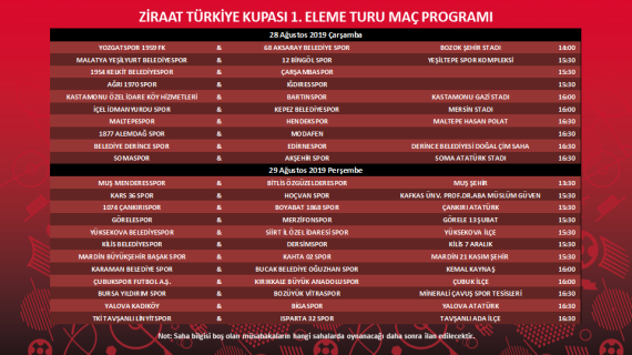 Turkuvaz Medya'nın yayıncısı olduğu Ziraat Türkiye Kupası 1. Eleme Turu karşılaşmalarının programı Türkiye Futbol Federasyonu'nun resmi internet sitesi üzerinden açıklandı.