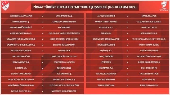 Turkuvaz Medya'nın yayıncılığını üstlendiği Ziraat Türkiye Kupası'nda 4. eleme turu eşleşmeleri belirlendi. Türkiye Futbol Federasyonu Riva Hasan Doğan Milli Takımlar Kamp ve Eğitim Tesisleri'nde, kulüp temsilcileri ve federasyon yetkililerinin katılımıyla gerçekleştirilen kura çekiminde, seri başı listedeki 13 Süper Lig ekibi dahil olmak üzere toplamda 54 takım yer aldı. Kastamonuspor'u eleyen G.Saray'ın Ofspor'la eşleştiği dev organizasyonda, Beşiktaş ise Serik Belediyespor'la eşleşti. 8-9-10 Kasım tarihlerinde, tek maç eleme sistemine göre oynanacak karşılaşmalarda kazanan ekipler, 32 takımın yer alacağı 5. eleme turunda mücadele etme hakkı kazanacak. Ziraat Türkiye Kupası'nın heyecanı her zaman olduğu gibi A Spor ekranlarından yaşanacak.