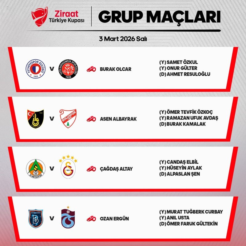Ziraat Türkiye Kupası'nda 4. haftada 3 Mart Salı günü oynanacak 4 müsabakanın hakemleri belli oldu. Galatasaray'ın deplasmanda Corendon Alanyaspor ile yapacağı müsabakayı Çağdaş Altay, RAMS Başakşehir'in sahasında Trabzonspor ile oynayacağı karşılaşmayı ise Ozan Ergün yönetecek.