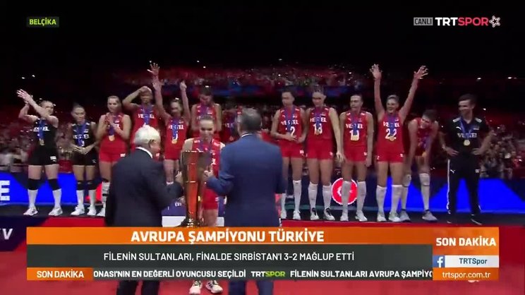 Dünya bir numarası A Milli Kadın Voleybol Takımımız, şimdi de Avrupa Şampiyonu oldu. Filenin Sultanları, Belçika, Estonya, Almanya ve İtalya'nın ev sahipliği yaptığı 2023 CEV Avrupa Voleybol Şampiyonası finalinde Sırbistan ile karşılaştı. Belçika'nın başkenti Brüksel'deki Palais 12 Spor Salonu'nda oynanan maçta rakibini 25-27, 25-20, 22-25, 25-21, 15-13’lük setlerle 3-2 yenen A Milli Kadın Voleybol Takımımız, mutlu sona ulaştı. Sultanlar şampiyonluk kupasını ise böyle kaldırdı. | İŞTE O ANLAR