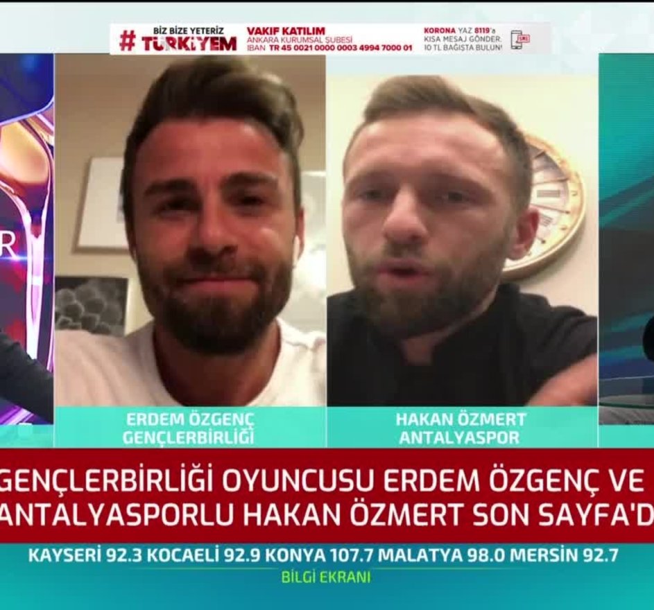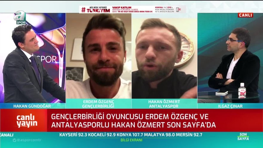 Gençlerbirliği oyuncusu Erdem Özgenç ve Antalyasporlu Hakan Özmert A Spor'da Son Sayfa programına konuk oldular ve özel açıklamalarda bulundular. Hakan Gündoğar'ın, "Geçen gün programda sevgili İlhan Parlak'a, Erdem kadar çalışıyorsan eğer, lige kesin olarak hazırsın dedim. O da, sadece göstermelik 15 saniyelik videoda çalışıyor dedi." sözlerine karşılık Erdem Özgenç ise gülerek, "Yalan söylüyor be abi... Yalancı biraz biliyor musun?" yanıtını verdi.