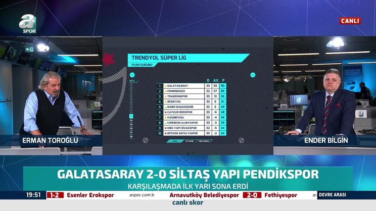 Trendyol Süper Lig'in 33. haftasında Galatasaray, Siltaş Yapı Pendikspor ile karşı karşıya geldi. Mücadelenin ilk yarısının ardından Erman Toroğlu değerlendirmelerde bulundu. GS SPOR HABERLERİ