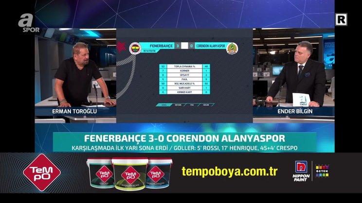 Son dakika spor haberi: Fenerbahçe ile Alanyaspor, Spor Toto Süper Lig'in 7. haftasında Kadıköy Ülker Stadyumu'nda karşı karşıya geldi. A Spor yorumcusu Erman Toroğlu, mücadelenin ilk yarısını değerlendirdi. Toroğlu, "Jorge Jesus ve Fenerbahçe iyi gidiyor. Sezon sonuna kadar şampiyonluğu kovalar. 3 favori varsa 1 tanesi Fenerbahçe. Fenerbahçe yılın sonuna kadar şampiyonluğu götürür." dedi.