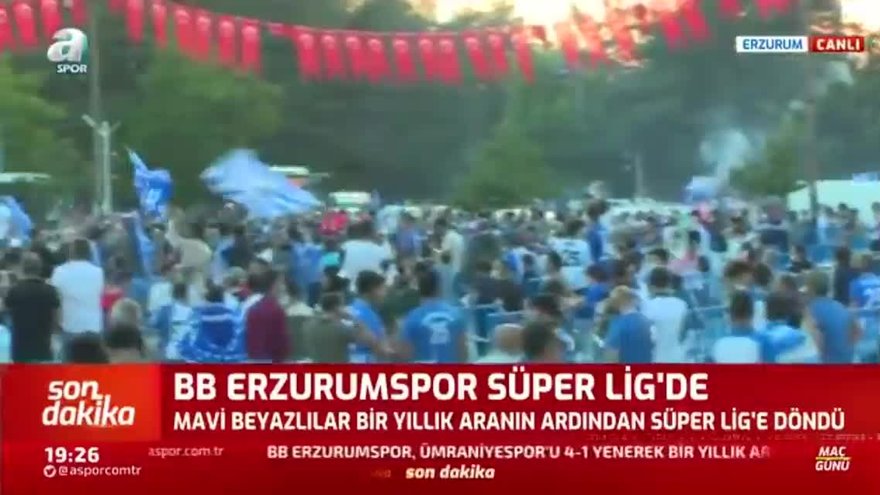 TFF 1. Lig'de lider Hatayspor'un ardından Süper Lig'e yükselen ikinci takım BŞB Erzurumspor oldu. Dadaşlar, 34. haftada konuk ettiği Ümraniyespor'u 4-1 mağlup ederek ligi ikinci sırada tamamladı ve 1 sezon aradan sonra Süper Lig'e yeniden 'merhaba' dedi. Erzurum'da taraftarlar ise Süper Lig coşkusunu böyle yaşadı. İşte o görüntüler...