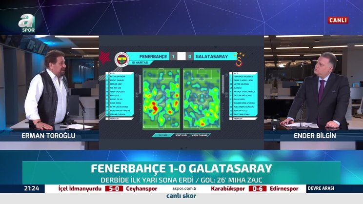 Süper Lig'in 32. haftasında Fenerbahçe ile Galatasaray dev derbide karşı karşıya geldi. Zorlu mücadelede sarı lacivertli ekip ilk yarıyı 1-0 önde kapattı. A Spor yorumcusu Erman Toroğlu derbinin ilk 45 dakikasını değerlendirdi. Toroğlu, "Serdar Aziz elinde sarı kart ile oynuyor. Fenerbahçe için çok büyük tehlike. Bir pozisyonda rakibi ile mücadele etti. Topu kaptırsaydı ikinci sarıyı yiyebilirdi. Elinde kırmızı ile oynuyor. İsmail Kartal bir şeyler yapabilir." dedi. | Fenerbahçe - Galatasaray haberleri (FB - GS spor haberi)