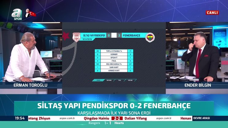 Trendyol Süper Lig'in 10. haftasında Pendikspor ile Fenerbahçe karşı karşıya geldi. A Spor yorumcusu Erman Toroğlu, mücadelenin ilk yarısı hakkında değerlendirmelerde bulundu. Toroğlu, "Fenerbahçe çabuk oynadığında 2 golü buldu. Bu 15 dakikayı kapatalım. Böyle bir maçta ne konuşacağız? Fenerbahçe - Galatasaray maçına kadar lig böyle olacak herhalde." ifadelerini kullandı. | Fenerbahçe haberleri