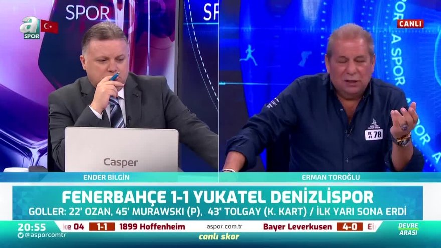 A Spor yorumcusu Erman Toroğlu, Fenerbahçe - Denizlispor maçının ilk yarısını değerlendirdi. Toroğlu, "Fenerbahçe seyircisi Ali Koç'a "senin yaptığın iş iyi değil" mesajını veriyor." ifadelerini kullandı.