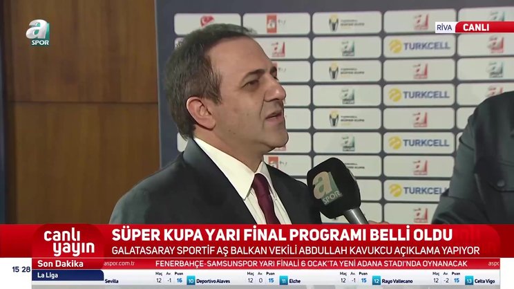 Turkcell Süper Kupa'da yarı final maçlarının hangi stadyumlarda oynanacağı yapılan kura çekiminin ardından belli oldu. Galatasaray, Trabzonspor ile karşılaşacağı mücadeleyi 5 Ocak'ta Gaziantep Stadyumu'nda oynayacak. Kura çekiminin ardından sarı-kırmızılılarda Sportif A.Ş. Başkan Vekilli Abdullah Kavukcu açıklamalarda bulundu. İşte o sözler...