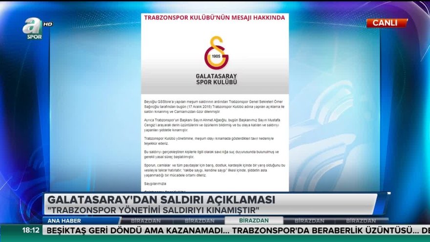 Galatasaray Kulübü, Beyoğlu Gsstore'a yapılan saldırının ardından Trabzonspor camiasının gösterdiği tavır nedeniyle bordo mavili kulübe teşekkür etti...