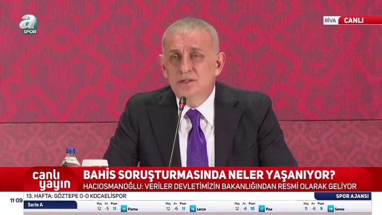 Türkiye Futbol Federasyonu (TFF) Başkanı İbrahim Hacıosmanoğlu, bahis soruşturmasıyla ilgili son gelişmeleri paylaştı. Hacıosmanoğlu, "Bilgiler yeteri derecede alındı mı, 6 tane şirket var, 1'inin lisansı iptal edilmiş. Hangi verilere göre tam sağlıklı aldınız mı hepsini diyorlar. Biz bu şirketlerden bilgileri istedik, ilk etapta gelen bilgileri bir kenarda bekletemezsiniz. Bize gelen bilgileri, Hukuk Kurulu titizlikle inceleyip PFDK'ye sevklerini yaptı. Eksik veya gelmeyen bilgilerle ilgili, Bakanlık üzerinden aynı firmalardan bilgi talep ettik. Belli kısmı geldi. Gelmeyenlerle ilgili de, burada tarihi de var, Savcılığa suç duyurusunda bulunduk, verilmeyen verilerle ilgili. Savcılık da aynı firmalardan bilgi talep etti. Umut ediyorum ki onlar da en yakın zamanda gelecek." dedi.