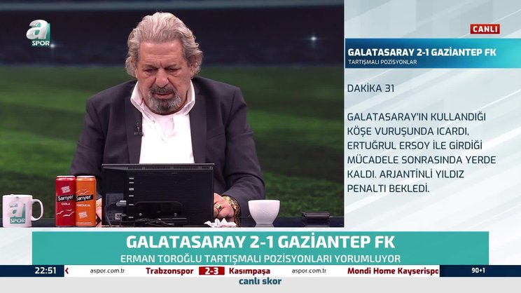 Trendyol Süper Lig'in 23. haftasında Galatasaray sahasında Gaziantep FK'yı 2-1'lik skorla mağlup ederek zirve takibini sürdürdü. A Spor yorumcusu Erman Toroğlu, 31. dakikada Ertuğrul Ersoy'un Mauro Icardi'ye yaptığı müdahaleyi değerlendirdi. Toroğlu, "Icardi'nin yükselmesine izin vermiyor, penaltı olmalıydı." ifadelerini kullandı.