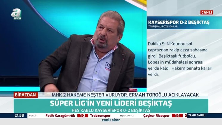 Son dakika Beşiktaş (BJK) haberi: Süper Lig'in 16. haftasında Beşiktaş, deplasmanda Kayserispor'u 2-0 mağlup etti. Karşılaşmanın ardından A Spor yorumcusu Erman Toroğlu, maçtaki tartışmalı pozisyonları değerlendirdi. Beşiktaş'ın kazandığı ilk penaltıyı yorumlayan Toroğlu, "Beşiktaş'ın lehine verilen ilk penaltı, çok net penaltı değil! Hakemler N'Koudou'ya dikkat etsinler, devamlı yapıyor." ifadelerini kullandı.