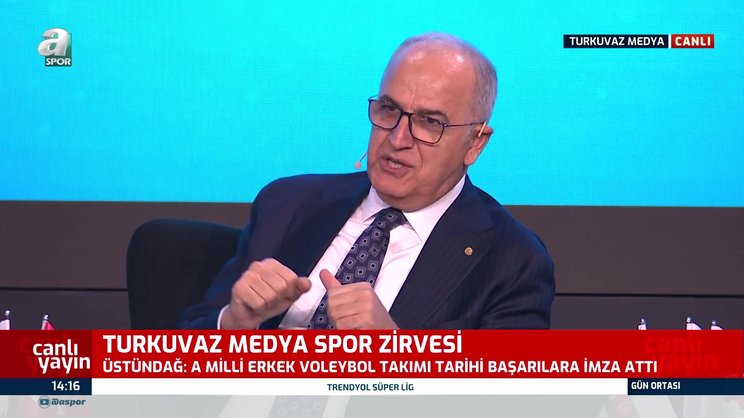 Türkiye Voleybol Federasyonu (TVF) Başkanı Mehmet Akif Üstündağ, Turkuvaz Medya Spor Zirvesi'nde açıklamalarda bulundu. Üstündağ, "Türk sporunu bu kadar seven, Türk sporunun bu kadar içinde olan bir Cumhurbaşkanı'na sahibiz. 2026 Avrupa Şampiyonası'nı Başkan Erdoğan'ın destekleriyle aldık." dedi.