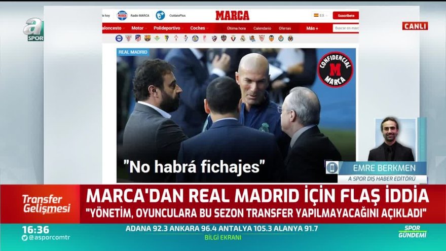 İspanyol basınından Marca'nın iddiasına göre Real Madrid bu sezon transfer yapılmayacağını oyuncularına açıkladı. Son gelişmeleri A Spor Dış Haber Editörü Emre Berkmen aktardı. Berkmen, "Corona virüsü salgınının kulüpleri nereye getirdiğini gösteren bir haber" ifadelerini kullandı.