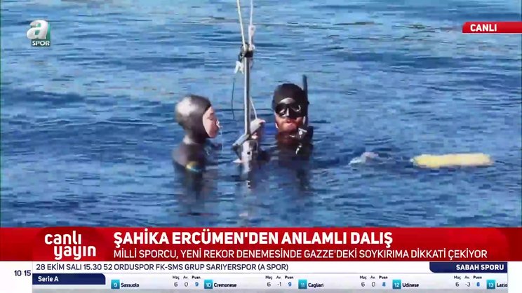 Dünya dalış rekortmeni milli sporcu ve Birleşmiş Milletler "Sudaki Yaşam" savunucusu Şahika Ercümen, Gazze'deki ateşkes anlaşması sonrası "Gazze nefes alsın, karanlıklar aydınlığa çıksın" sloganıyla kendine ait dünya rekorunu 107 metre ile yeniledi.