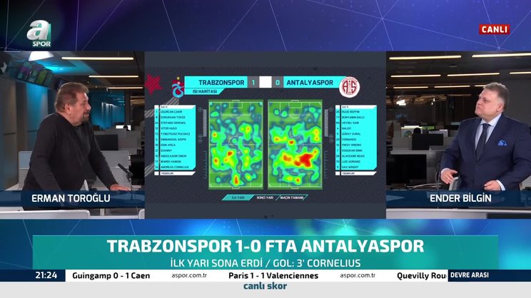 Trabzonspor Antalyaspor maçı haberleri: Spor Toto Süper Lig'in 35. haftasında lider Trabzonspor, Antalyaspor'u evinde konuk etti. Maçın 3. dakikasında Abdülkadir Ömür'ün dip çizgiden içeriye çevirdiği topta Andreas Cornelius tek vuruşta golü buldu ve Fırtına 1-0 öne geçti. A Spor yorumcusu Erman Toroğlu ilk 45 dakikayı değerlendirdi. Toroğlu, "Tam Nwakaeme'nin maçı. Hamsik'in sahneye çıkması lazım. Visca da etkili değil. Bu oyuncuların oyunu soğutmaları lazım. Şu anda yangın var." dedi.