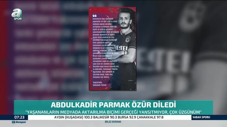 Trabzonspor'un Süper Lig'in 36. haftasında Galatasaray ile oynadığı karşılaşmadaki disiplinsiz davranışı nedeniyle süresiz olarak kadro dışı bırakılan oyuncusu Abdulkadir Parmak, özür diledi.
