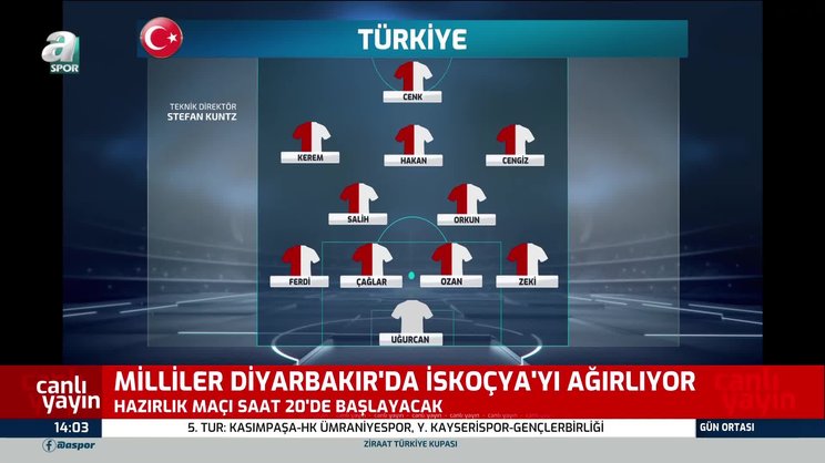 TÜRKİYE - İSKOÇYA CANLI İZLE | Türkiye ile İskoçya, hazırlık maçında kozlarını paylaşıyor. Zorlu mücadele 16 Kasım Çarşamba günü saat 20:00'de Diyarbakır Yeni Stadyumu'da başlayacak. Karşılaşma TRT 1'den naklen yayınlanacak. TÜRKİYE - İSKOÇYA CANLI izle...
