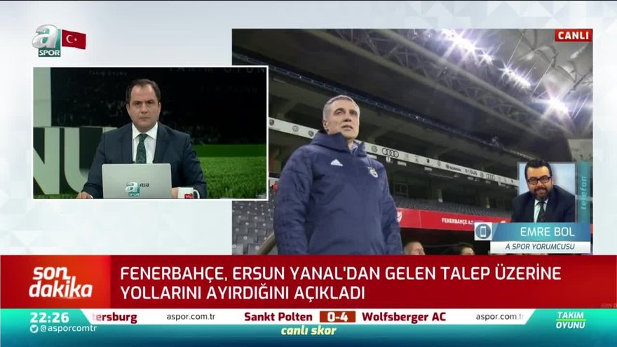 Fenerbahçe, resmi internet sitesinden yaptığı açıklamayla teknik direktör Ersun Yanal ile yolların ayrıldığını açıkladı. Konuyla ilgili değerlendirmelerini Takım Oyunu programına canlı bağlanarak aktaran A Spor yorumcusu Emre Bol, sarı-lacivertli kulübün Yanal ile yollarını ayırmasının doğru bir karar olduğunu belirtti.