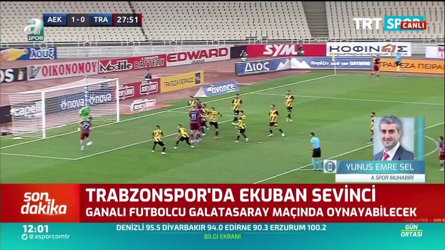 Trabzonspor'da sakatlığı bulunan Caleb Ekuban'ın Galatasaray maçında oynayabileceği bildirildi. Bordo-mavililerdeki son gelişmeleri A Spor muhabiri Yunus Emre Sel aktardı. Sel, "Ekuban ve Abdulkadir Parmak oynayabilecek durumda, Nwakaeme'nin durumu ise hafta içinde yapılacak antrenmanlar sonrası netlik kazanacak" ifadelerini kullandı.