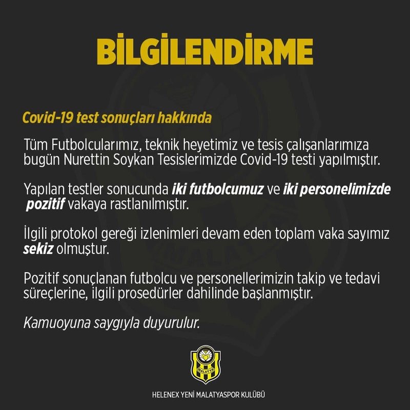 Spor Toto Süper Lig'in 33. haftasında sahasında Fenerbahçe'yi konuk edecek olan Yeni Malatyaspor'da 4 ismin corona virüsü testi pozitif çıktı. Sarı-siyahlı kulüpten yapılan açıklamaya göre, iki personel ve iki futbolcuda pozitif vakaya rastlandı.